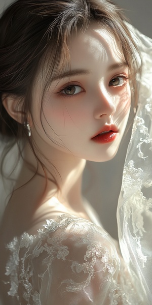 18岁美丽的姑娘,精致的妆容,大眼睛,披肩发,淡红色口红,半身婚纱
